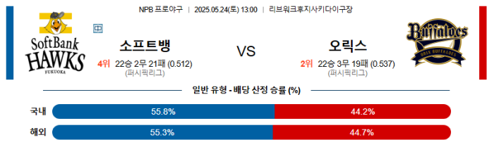 최근 오릭스의 경기력은 그다지 좋다고 할수 없는 편이다. 반면 소프트뱅크는 닛폰햄 원정에서 위닝 시리즈를 만들면서 기세를 올리고 있는 중. 금년의 아즈마는 솔직히 기대가 어려운게 현실일 것이다. 물론 히가시하마 역시 좋다고 말하기엔 무리가 있는 투수지만 낮 경기에 강점이 있고 이는 소프트뱅크의 전체적인 움직임도 마찬가지다. 상성에서 앞선 소프트뱅크 호크스가 신승을 가져갈 것이다.