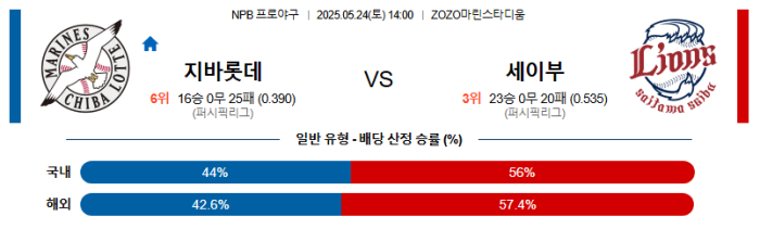 치바 롯데의 타격이 확실히 살아났다. 그러나 저속 투수인 요자 이후 강속구 투수인 이마이를 만난다는건 솔직히 좋은 결과를 기대하기 어렵다. 물론 새먼스가 직전 등판에서 좋은 투구를 해냈다는건 부인할수 없지만 홈 경기의 바람은 오히려 새먼스에게 독이 될수 있고 세이부의 불펜은 최소한 리드는 지킬수 있다. 선발에서 앞선 세이부가 승리를 가져갈 것이다.
