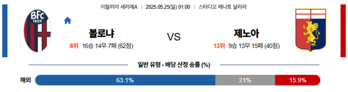 볼로냐는 최근 수비 불안에도 불구하고 공격 전개에서는 여전히 활력을 보이고 있다. 홈 이점과 2선의 창의적 연계는 제노아의 무너진 수비라인을 충분히 공략할 수 있는 요소다. 제노아는 수비진의 결장 여파와 중원에서의 압박 대응 부족으로 인해 실점 가능성이 높고, 반격도 단조로운 패턴에 의존한다. 양 팀 모두 수비가 불안정한 만큼 다득점 경기가 예상되며, 볼로냐의 한 골 차 승리가 유력하다.