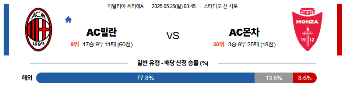 AC 밀란은 전력 손실이 있음에도 불구하고 몬차에 비해 스쿼드 깊이와 전술 완성도 면에서 우위에 있다. 특히 몬차는 수비 조직력 붕괴와 중원 핵심들의 연쇄 결장으로 인해 전체적인 운영 안정성이 떨어지는 상태다. 밀란은 최근 전방 공격력의 완성도가 떨어지나, 홈 이점을 기반으로 안정적인 경기 운영이 가능할 것으로 보인다. 득점은 많지 않겠지만, 실리적인 1~2득점 승리가 예상된다.