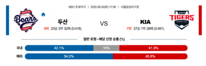2경기 연속 1:0 패배. 주말 시리즈의 후반은 두산에겐 최악이었다. 그러나 KIA 역시 현재 타선의 집중력은 좋다고 할수 없는 레벨. 곽빈은 유독 KIA만 만나면 잘 던지는 투수라는 점도 생각해야 한다. 양현종의 투구가 변수이긴 하지만 한번 흔들린 양현종은 이번 경기까진 고전 가능성을 높게 봐야 한다. 선발에서 앞선 두산이 승리를 가져갈 것이다.