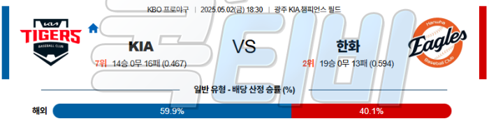 한화는 그야말로 하늘이 돕는다는 느낌이 들 정도다. 불펜 운용이 힘든 날 비가 온건 정말로 한화에게 도움이 되는 포인트. 최근 올러의 투구는 분명히 좋은 편이고 홈 야간 경기라는 강점도 있다. 물론 엄상백이 직전 경기에서 살아나긴 했지만 KIA가 직전에 만난 투수는 하필 라일리고 이는 KIA 타선에게 엄상백 공략의 난이도가 조금 낮아짐을 뜻한다. 선발에서 앞선 KIA가 승리를 가져갈 것이다.