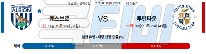 결국 압박 강도와 전환 속도 모두에서 웨스트 브로미치가 루턴타운을 압도하는 흐름이 예상된다.