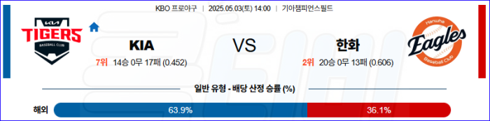 최근 KIA 최대의 문제는 강속구 대처가 전혀 되지 않는다는 점이다. 즉, 문동주 상대로 고전 가능성이 높은 편. 네일이 리그 최고급 에이스인건 맞지만 낮 경기에서 종종 공이 몰리는 경우가 있고 현재의 한화 타선은 장타력이 좋다. 그리고 불펜의 우위도 한화가 가지고 있다. 힘에서 앞선 한화가 승리를 가져갈 것이다.