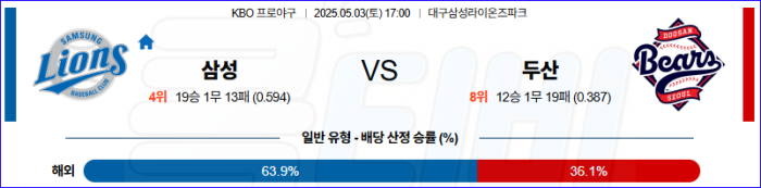 홈 경기의 삼성은 파워로 승부를 볼수 있다. 전날 경기는 그러한 삼성의 강점을 유감없이 보여준 경기라고 할수 있을듯. 게다가 레예스는 홈 경기 강점이 있고 최승용은 홈런이 항상 문제가 되는 투수다. 무엇보다 로그 뒤의 최승용은 최승용이 절대적으로 불리하다. 선발에서 앞선 삼성이 승리를 가져갈 것이다.
