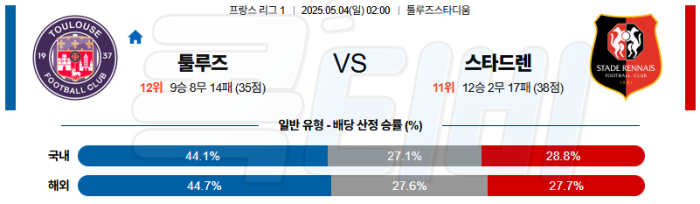 툴루즈는 홈에서의 수비 밀도, 공간 통제 능력, 전환 효율 모두에서 스타드렌보다 안정적인 흐름을 유지할 수 있는 팀이다.