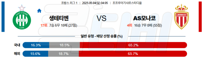 생테티엔은 빠른 측면 전개와 전방 압박으로 주도권을 잡으려 하지만, 중원과 수비 간격이 벌어지는 순간 AS모나코의 침투 패턴에 흔들릴 가능성이 크다.
